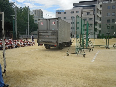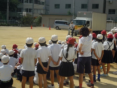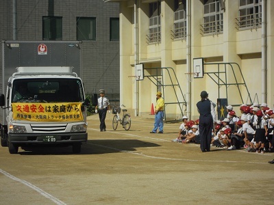 西警察、区のにっしーパトロール隊の方々に来ていただき、危険な自転車の乗り方やトラックの内輪差の実験などを見せていただきました。事故防止のため、ご家庭でも子どもと交通安全についてお話しください。