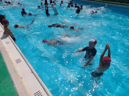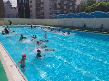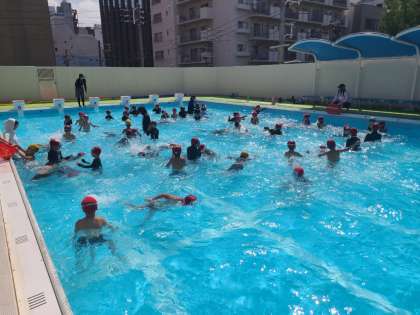 画像は1年生のプール納めの様子です。バタ足しながらまたは浮きながら進んだり、顔をつけながら進んだりと、それぞれの習熟に応じて水中を進めるようになっていました。 最後は水中宝探しで、今年のプールでの活動を締めくくりました。