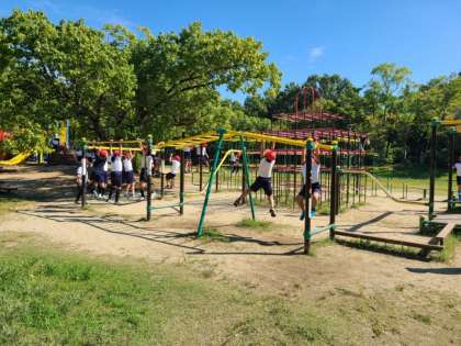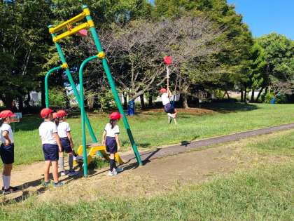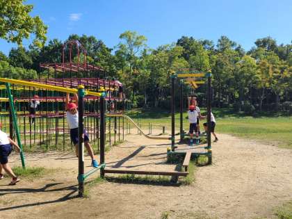 さっそく、園内のわんぱくランドで遊具遊びをしました。