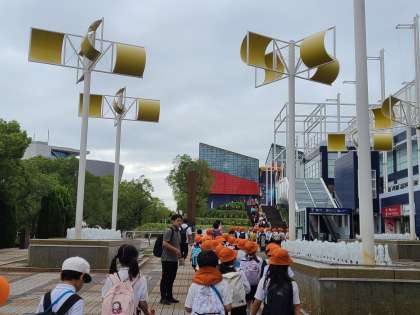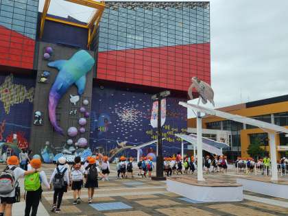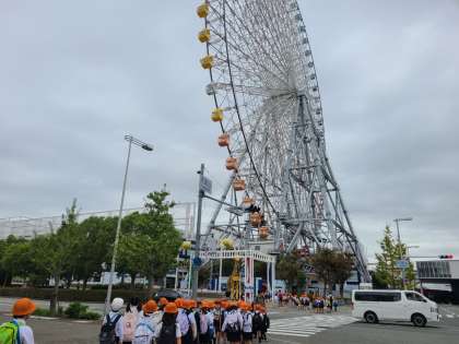 大きな観覧車と海遊館の建物を前にテンションが上がっています。