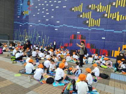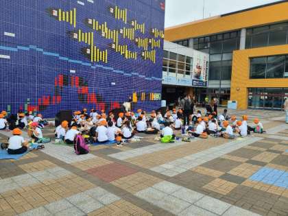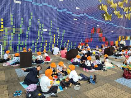 海遊館の建物の前で、お弁当におやつにと、昼休みを過ごしています。