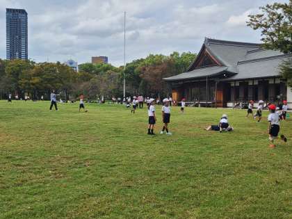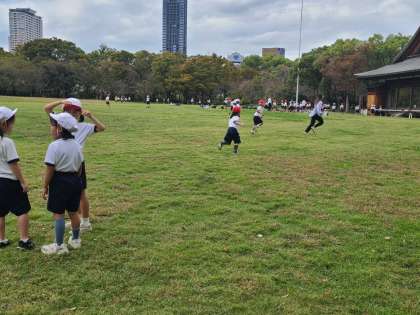弁当タイムを終えて、自由遊びの時間です。広い芝生広場を思い思いにかけ巡っています。