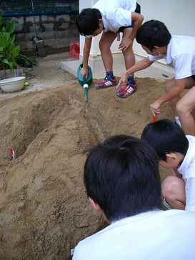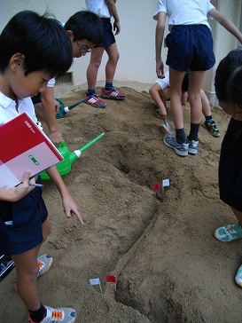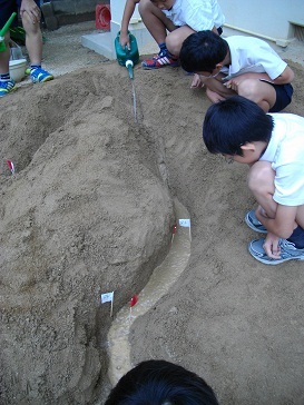 流れる水と地面の様子の実験をしました。水が流れることによって、地面が削られたり土が運ばれたり積もらせたりすることがわかりました。