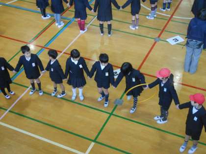 今日の児童集会では、班別に「フープくぐり競争」を