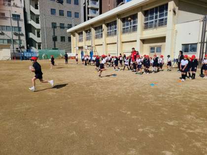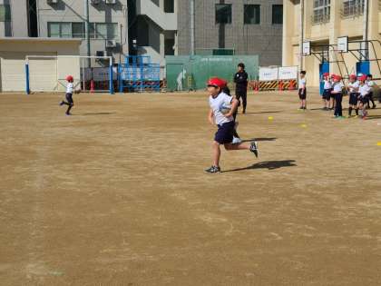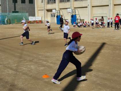 ラグビーボールを持って走り、そして最後にパスして、折り返しリレーで競い合いました。