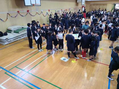ファミリー班の仲間が分担をして作り上げたメッセージ色紙を6年生一人一人にプレゼントしました。