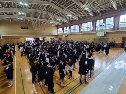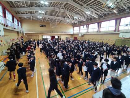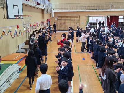 6年生を花道で送りました。感極まって涙が頬を伝うようすの子どもたちも見られました。