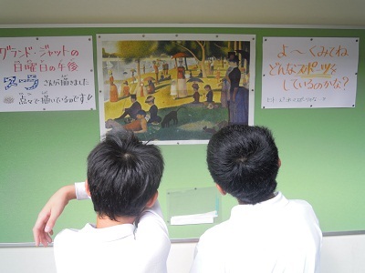 ジョルジュ・スーラの描いた有名な「グランド・ジャット島の日曜日の午後」の絵を見て、どんなスポーツをしているのか探します。絵をよく見てね。