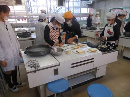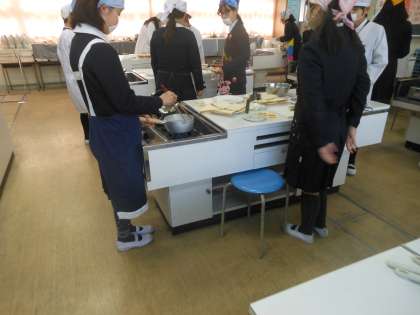 家庭科の授業で、調理実習をしています。