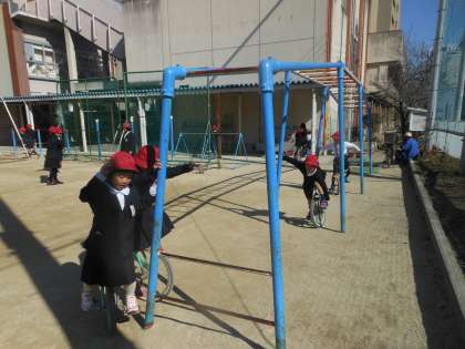 低学年の児童は、一輪車で遊んだり、コンビネーシヨン