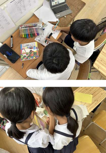 写真1枚目は、美化委員会です。校内を綺麗にするため、「くつ箱をきれいに使おう」というポスター作りをしていました。