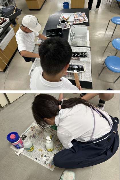 写真3枚目は、飼育栽培委員会です。デジタルが主流のこのご時世ですが、今日の委員会活動では、紙を切ってインクを塗って、手作りで植物の看板を作っていました。