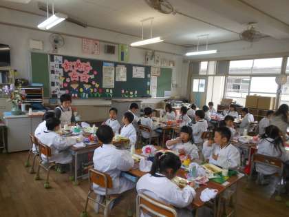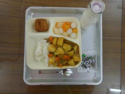今日のメニューは、カツカレーライス、フルーツ白玉