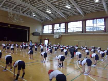 低学年の練習は、隊列を作りラジオ体操から