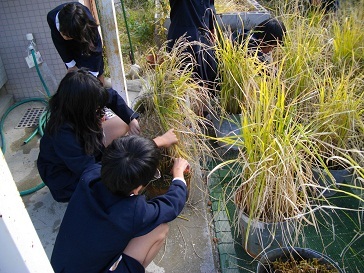 4月から始めた米作り。世話の甲斐あってたくさん実りました。とれたお米は、調理実習の時に食べる予定です。味はどうかな?刈り取った藁はたい肥として使います。