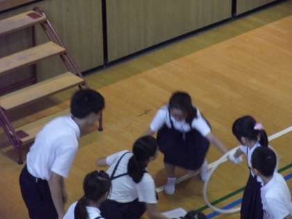 児童集会では、班対抗「フープくぐり」を