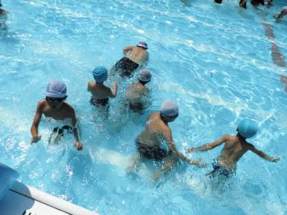 プールでは、皆で列をつくってプールの中を