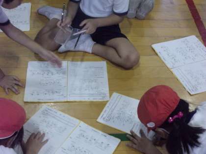 マット運動の後、全員集合して「友達のうまかった点」