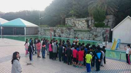 朝の会議。ホテルのプールサイドで、朝の会をしています。