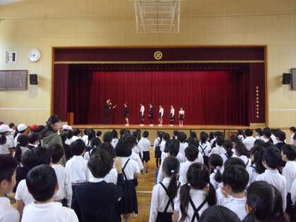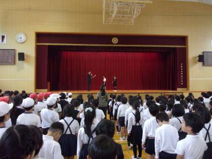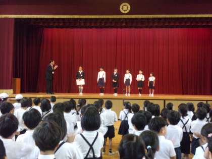 児童朝会では、「大阪市小学校児童絵画・版画展」で