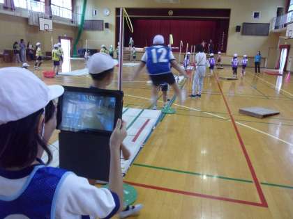 タブレットを使って、自分たちの高跳びを