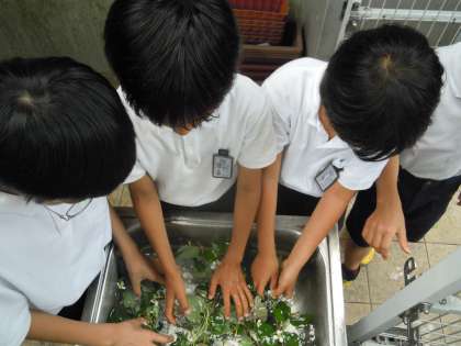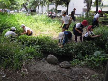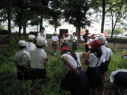 5年生は今度の土曜(日曜)授業で、ドクダミを使った染物をします。その時に使うドクダミを阿波座南公園のビオトープ周辺で刈り取りました。当日どのように染まるか楽しみですね。