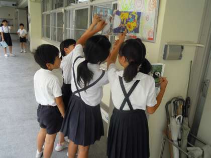 算数で「角の大きさをはかろう」という学習をしています。校内のいろいろな角度を自作の分度器で測りました。「ここにも傾きがある!」と楽しく学習しました。