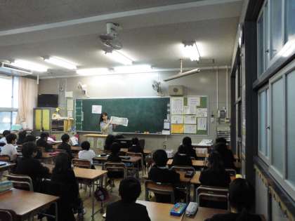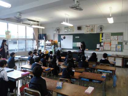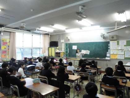 写真は、2年1組、3年1組の読み聞かせの様子です。