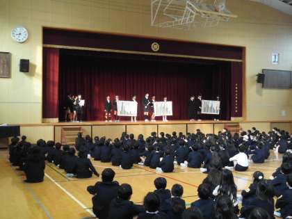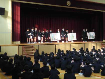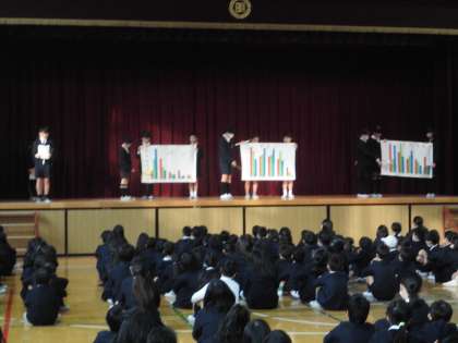 給食委員会のメンバーは、児童たちに「パン」「やさい」
