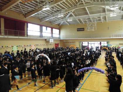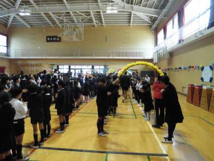 児童たちが作ったお手製アーチの下、1年生〜5年生児童の