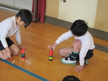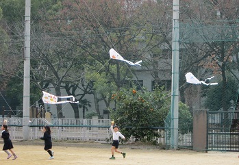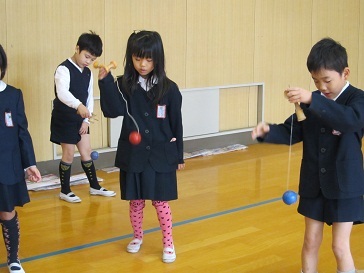 凧あげ、コマ回し、だるま落とし、けん玉、お手玉で遊びました。