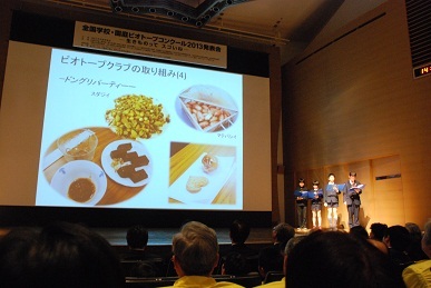 学校・地域を代表して総勢20名が表彰式に参加しました。ビオトープクラブに所属していた中高校生OBと現在の部長・副部長が、会場で取り組みの発表をし、表彰状をいただきました。