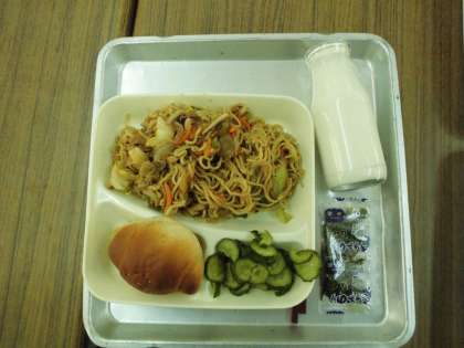 今日の給食は、「焼きそば」「きゅうりのしょうがづけ」