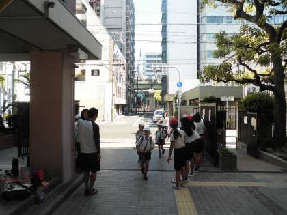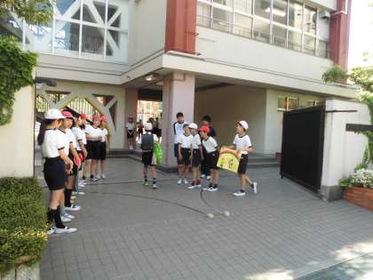 5年生・6年生を中心に、校門で元気よく大きな声で