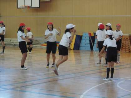体育館で、高難度のダブルダッチを練習する