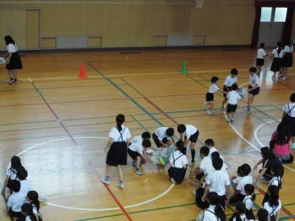 乗せて、3〜4人でボール運びゲームを行いました。
