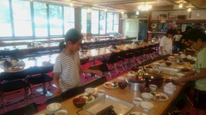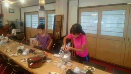 各班の食事係の児童が、朝ごはんの準備をします。