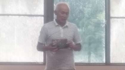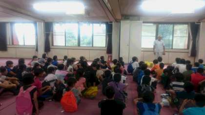 次の活動は、焼き板づくりです。谷常のご主人から、説明を受けています。