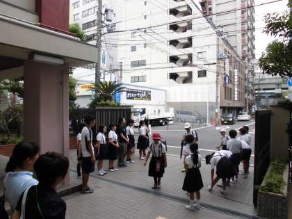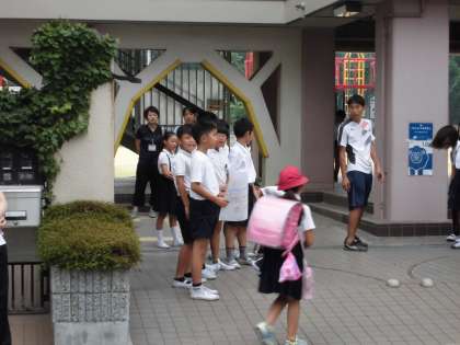 今日は校門で5年2組児童が、元気にあいさつ運動を
