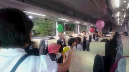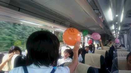 長島スパーランドを後にして、次の目的地二見プラザに向かっています。現在は、バスレクで風船ジャンケンで盛り上がっています。