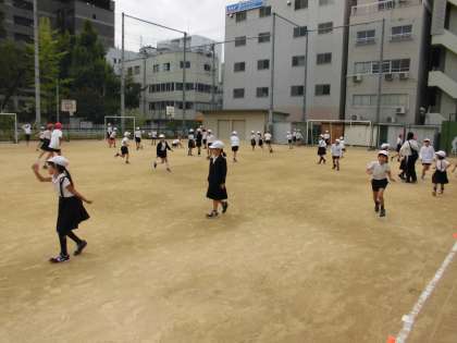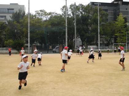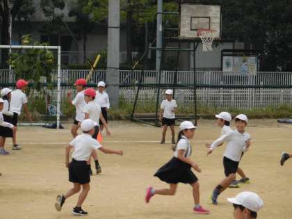 おに役の体育委員は、けんけんで2年児童を追いかけて