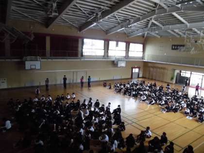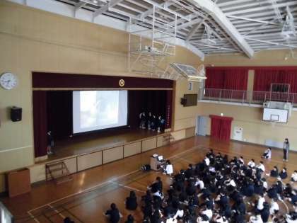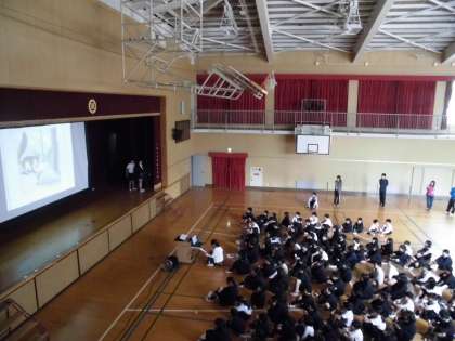 スクリーンを使用して「動いちゃだめ」の読み聞かせを