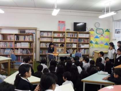 昼休みには、図書館で児童たちに紙芝居を披露して