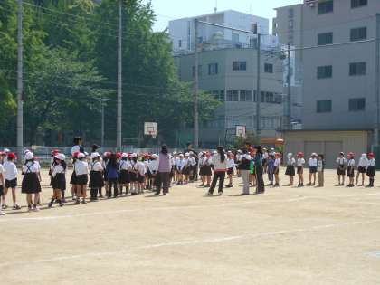 今日は、団体演技の並ぶ体系を運動場でマスターしました。