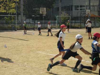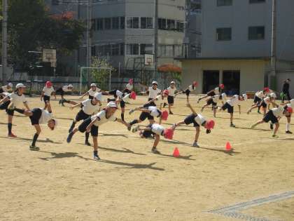 暖かい日差しのもと、3年生の体育の授業風景です。