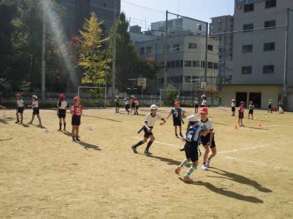 最初に、準備体操を行い、タグ・ラグビーで体を