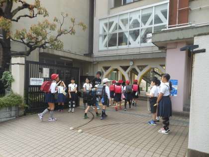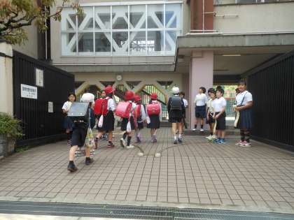 委員会のメンバーからの元気なあいさつに、登校してきた児童