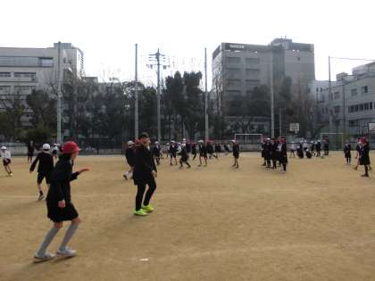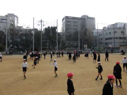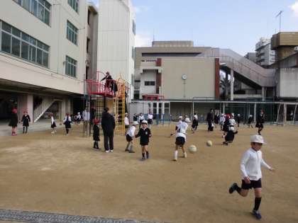 多くの児童が、ドッジボール、なわとび、おにごっこ