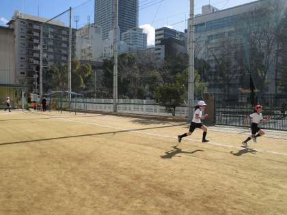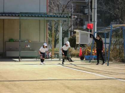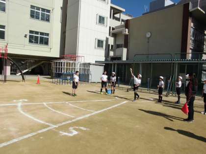 5年2組では、体力測定のうち、「ソフトボール投げ」