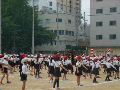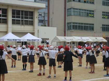 運動場で、運動会の集合隊形で整列後、ラジオ体操を